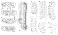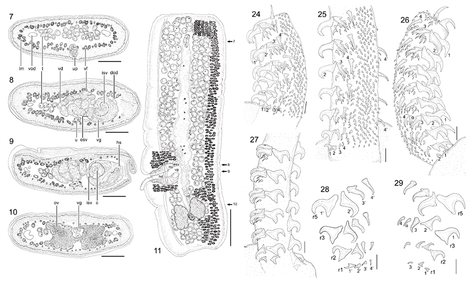 FIGURES 7–11. Grillotia patagonica n. sp. (7–10) Cross sections of a gravid proglottid (robust form), scale bar=250 µm. (7) At level of uterine pore. (8) At level of hermaphroditic sac (external semin... MoreFIGURES 7–11. Grillotia patagonica n. sp. (7–10) Cross sections of a gravid proglottid (robust form), scale bar=250 µm. (7) At level of uterine pore. (8) At level of hermaphroditic sac (external seminal vesicle). (9) At level of hermaphroditic sac (internal seminal vesicle). (10) At level of ovarian isthmus. (11) Gravid proglottid (robust form), ventral view, circummedullar vitelline follicles partially drawn to allow the view of internal organs, scale bar=500µm. Arrows indicate the level of cross sections in Figures 7–10. Abbreviations: c, cirrus; dod, dorsal osmoregulatory duct; esv, external seminal vesicle; hd, hermaphroditic duct; hs, hermaphroditic sac; isv, internal seminal vesicle; lm, longitudinal musculature; ov, ovary; t, testis; u, uterus; up, uterine pore; vg, vagina; vd, vas deferens; vf, vitelline follicles; vod, ventral osmoregulatory duct. FIGURES 24–29. Tentacular armature of Grillotia patagonica n. sp. (24) Antibothrial surface (plerocercus ex Patagonotothen brevicauda), scale bar= 30 µm. (25) External surface (immature worm ex Psammobatis rudis), scale bar=30 µm. (26) Bothrial surface (plerocercus ex P. brevicauda), scale bar= 30 µm. (27) Internal surface (plerocercus ex P. brevicauda), scale bar=30 µm. (28) Profile of hooks along the tentacle, antibothrial surface (plerocercus ex Nemadactylus bergi), scale bar = 30 µm. (29) Profile of hooks along the tentacle, bothrial surface (plerocercus ex N. bergi), scale bar = 30 µm. Abbreviations: r1, row 1; r2, row 2; r3, row 3; r5, row 5. |