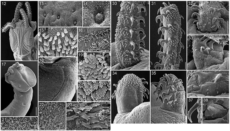 FIGURES 12–23. Grilllotia patagonica n. sp., scanning electron micrographs. (12) Scolex, plerocercus ex Patagonotothen ramsayi, scale bar=200 µm; small numbers indicate locations of details shown in F... MoreFIGURES 12–23. Grilllotia patagonica n. sp., scanning electron micrographs. (12) Scolex, plerocercus ex Patagonotothen ramsayi, scale bar=200 µm; small numbers indicate locations of details shown in Figures 13, 15, and 20. (13) Apex of scolex, scale bar=5 µm. (14) Detail of rounded projections with central cilium on the apex of the scolex, scale bar = 1 µm. (15) Anterior margin of the distal bothrial surface, scale bar = 2 µm. (16) Detail of bothrial groove, scale bar=5 µm. (17) Scolex of immature worm ex Psammobatis rudis, scale bar=200 µm; small numbers indicate locations of details shown in Figures 21 and 22. (18) Bothrial groove, anterior margin of bothrium, scale bar=500 µm; small numbers indicate locations of details shown in Figures 16 and 19. (19) Most-anterior proximal bothrial surface, scale bar = 2 µm. (20) Center of distal bothrial surface, scale bar = 2 µm. (21) Surface of pars vaginalis, scale bar=1 µm. (22) Surface of pars bulbosa, scale bar= 1 µm. (23) Bifid and trifid spinitriches covering the proximal bothrial surface near bothrial groove, scale bar = 1 µm. FIGURES 30–38. Tentacular armature of Grillotia patagonica n. sp., scanning electron micrographs. (30) Antibothrial surface (plerocercus ex Patagonotothen ramsayi), scale bar=50 µm. (31) Bothrial surface (plerocercus ex P. ramsayi), scale bar=50 µm. (32) Internal surface (plerocercus ex P. ramsayi), scale bar = 50 µm. (33) First and second principal rows, bothrial surface (immature worm ex Psammobatis rudis), scale bar = 20 µm. (34) External surface (plerocercus ex Cottoperca gobio), scale bar = 30 µm. (35) Antibothrial surface (plerocercus ex C. gobio), scale bar = 50 µm. (36)
