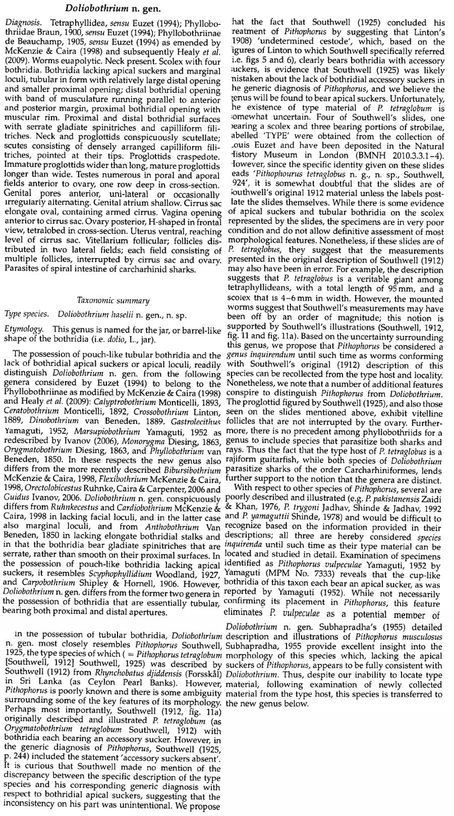 Caira, J. N., M. Malek, and T. Ruhnke. 2011. A new genus of Phyllobothriidae (Cestoda: Tetraphyllidea) from carcharhiniform sharks from Iran and Australia. Journal of Helminthology 85: 40-50.