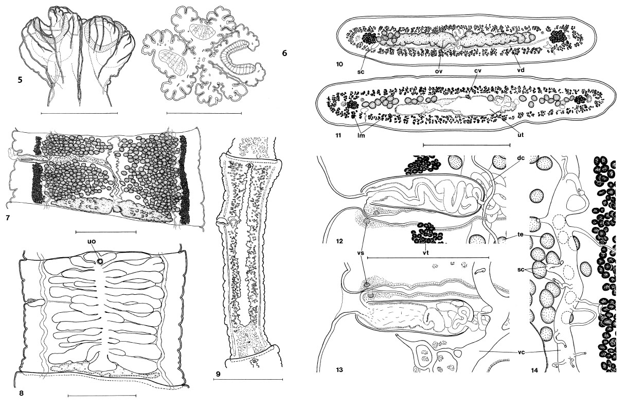 canal; vd, vitelline duct; vs, vaginal sphincter; vt, vitelline follicles. Scale bars, 10, 11 = 1,000 µm; 12-14 = 500 µm. |
