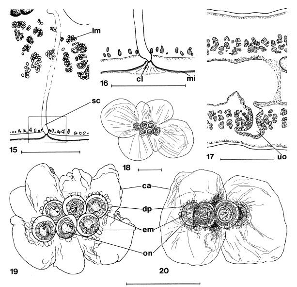 ventral uterine orifice (17). 18. Holotype, UNAM 4168, eggs spontaneously released to water. 19, 20. Paratype INVE 28986, eggs fixed with