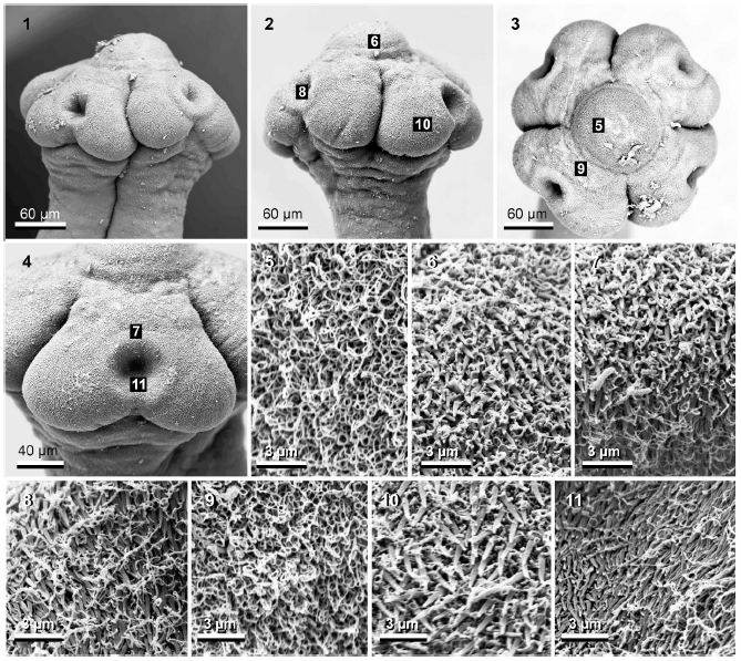 FIGURES 1–11. Pangasiocestus romani n. gen. and n. sp. from Pangasius larnaudii, Cambodia (VNT 270; paratype: MHNG INVE 75449). Scanning electron micrographs. (1) Scolex, dorsoventral. (2) Scolex, lat... MoreFIGURES 1–11. Pangasiocestus romani n. gen. and n. sp. from Pangasius larnaudii, Cambodia (VNT 270; paratype: MHNG INVE 75449). Scanning electron micrographs. (1) Scolex, dorsoventral. (2) Scolex, lateral. (3) Scolex, apical. (4) Detail of a sucker. (5) Capilliform filitriches near the center of the