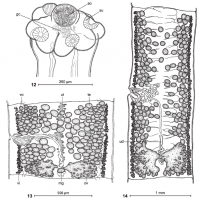 FIGURES 12–14. Pangasiocestus romani n. gen. and n. sp. (VNT 298x; holotype: MHNG INVE 79163) from P. larnaudii, Cambodia, line drawings. (12) Scolex, dorsal view. (13) Immature proglottis, dorsal vie... MoreFIGURES 12–14. Pangasiocestus romani n. gen. and n. sp. (VNT 298x; holotype: MHNG INVE 79163) from P. larnaudii, Cambodia, line drawings. (12) Scolex, dorsal view. (13) Immature proglottis, dorsal view. (14) Gravid proglottis, dorsal. Abbreviations: ao: apical organ; gc: gland cells; mg: Mehlis’ gland; ov: ovary; su: sucker; te: testes; ud: uteroduct; ut: uterus; vi: vitelline follicles; vo: ventral osmoregulatory canal. |