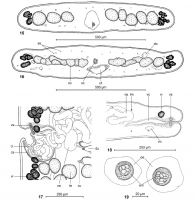 of proglottis (VNT 297; paratype: MHNG INVE 75450... MoreFIGURES 15–19. Pangasiocestus romani n. gen., and n. sp. from P. larnaudii, Cambodia, line drawings. (15) Cross section at level of the anterior part