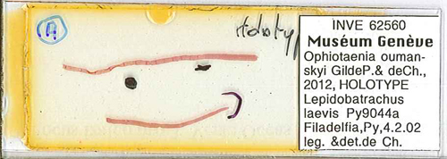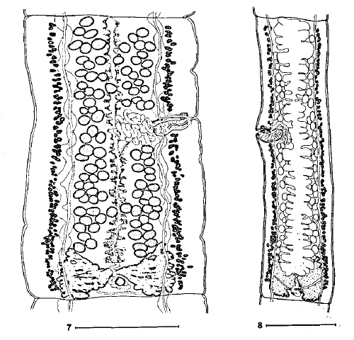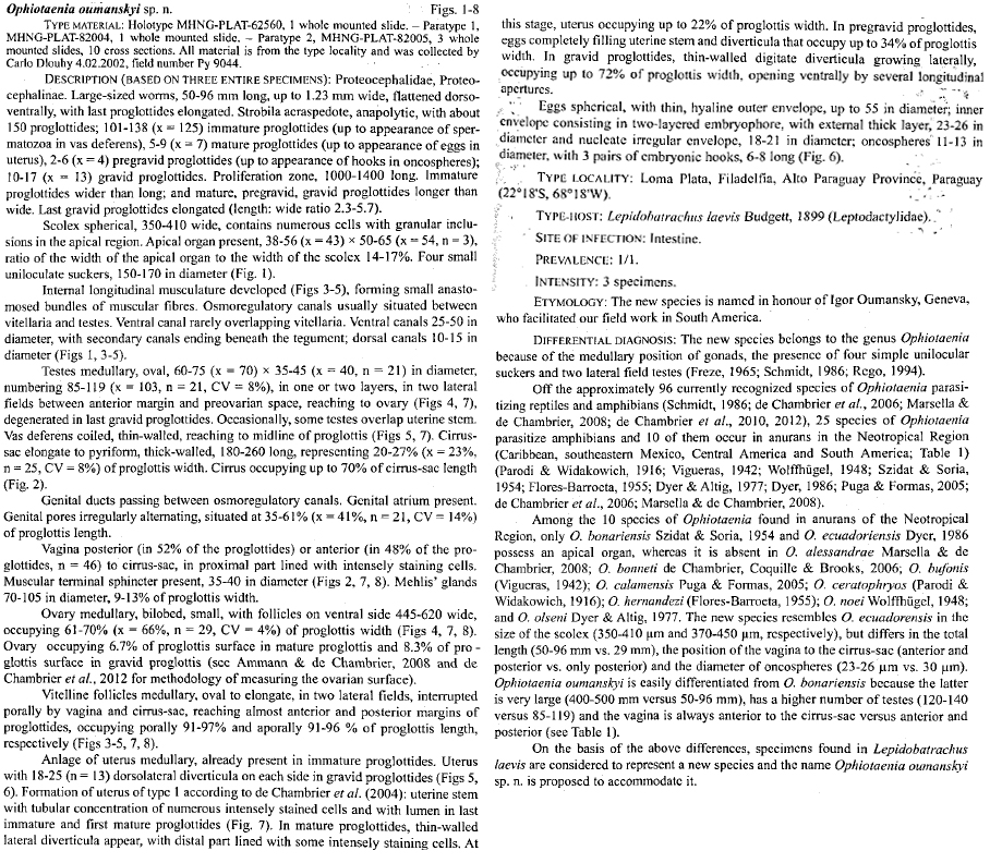 Figs 7, 8. Ophiotaenia oumanskyi sp. n. from Lepidobatrachus laevis. (7) MHNG-PLAT-62560, holotype, mature proglottis, dorsal view. (8) MHNG-PLAT-82004, paratype. Gravid proglottis, ventral view. Scal... MoreFigs 7, 8. Ophiotaenia oumanskyi sp. n. from Lepidobatrachus laevis. (7) MHNG-PLAT-62560, holotype, mature proglottis, dorsal view. (8) MHNG-PLAT-82004, paratype. Gravid proglottis, ventral view. Scale-bars: 7, 8 = 500 µm. |