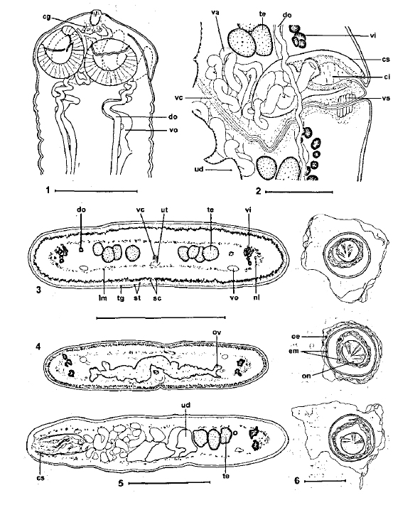 Figs. 1-6. Ophiotaenia oumanskyi sp. n. from Lepidobatrachus laevis. (1) MHNG-PLAT-62560, holotype 1. Scolex, dorsoventral view. (2) MHNG-PLAT-82004, paratype. Cirrus-sac and vagina, dorsal view; note... MoreFigs. 1-6. Ophiotaenia oumanskyi sp. n. from Lepidobatrachus laevis. (1) MHNG-PLAT-62560, holotype 1. Scolex, dorsoventral view. (2) MHNG-PLAT-82004, paratype. Cirrus-sac and vagina, dorsal view; note the presence of a vaginal sphincter. (3) MHNG-PLAT-82005, paratype. Mature proglottis, transverse section of posterior part level. (4) MHNG-PLAT-82005, paratype. Mature proglottis, transverse section at ovarian level. (5) Cross-section of gravid proglottis, at level of anterior part (6) MHNG-PLAT-82005, paratype 2. Eggs drawn in distilled water. Abbreviations: cg = glandular cells, probably of exocrine type, ci = cirrus, cs = cirrus-sac, do = dorsal osmoregulatory canal, em = embryophore, lm = internal longitudinal musculature, ln = longitudinal lateral nerves, oc = outer envelope, on = oncosphere, ov = ovary, sc = subtegumental cells, st = subtegumental muscle fibres, te = testes, tg = tegument, ud = uterine diverticula, ut = uterus, va = vas deferens, vc = vaginal canal, vi = vitelline follicles, vo = ventral osmoregulatory canal, vs = vaginal sphincter. Scale bars: 1, 5 = 250 µm; 2 = 100 µm, 3-4 = 500 µm, 6 = 20 µm. |