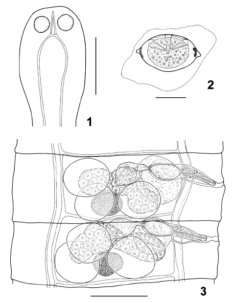 Fig. 1–3. Colibrilepis pusilla n. gen., n. sp. 1. Scolex. 2. Egg. 3. Hermaphroditic mature proglottides; note variation in position of testes. Scale bars: 1, 200 μm; 2, 20 μm; 3, 100 μm