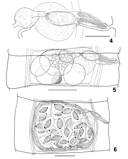 Fig. 4–6. Colibrilepis pusilla n. gen., n. sp. 4. Genital ducts. 5. Postmature proglottis. 6. Gravid proglottis. Scale bars: 4, 50 μm; 5, 6, 100 μm