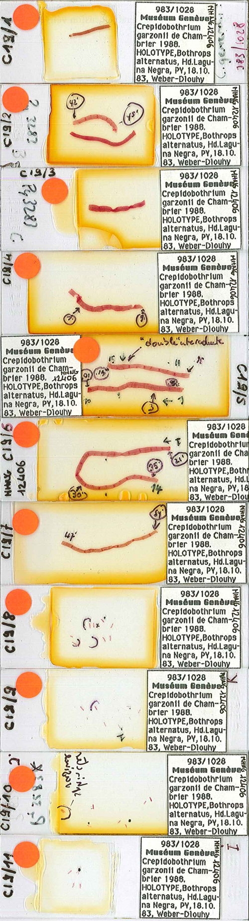 de Chambrier, A. 1988. Crepidobothrium garzonii n. sp. (Cestoda: Proteocephalidae) parasite de Bothrops alternatus Duml Bibr. & Dum., 1854 (Serpentes: Viperidae) au Paraguay. Revue Suisse de Zoologie 95: 1163-1170. (3917) Download PDF |