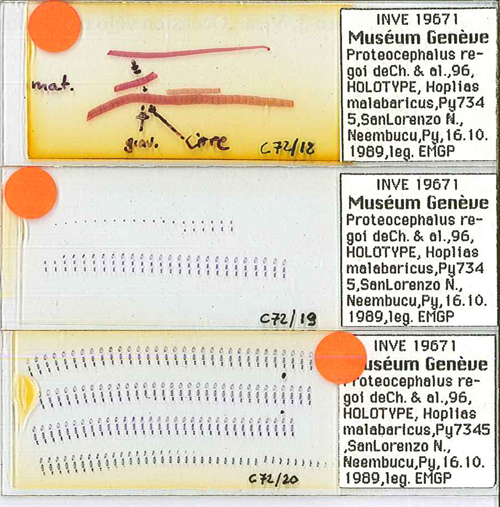 de Chambrier, A., T. Scholz, and C. Vaucher. 1996. Tapeworms (Cestoda: Proteocephalidea) of Hoplias malabaricus (Pisces: Characiformes, Erythrinidae) in Paraguay: description of Proteocephalus regoi sp. n., and redescription of Nomimoscolex matogrossensis. Folia Parasitologica 43: 133-140. (3922) Download PDF |
