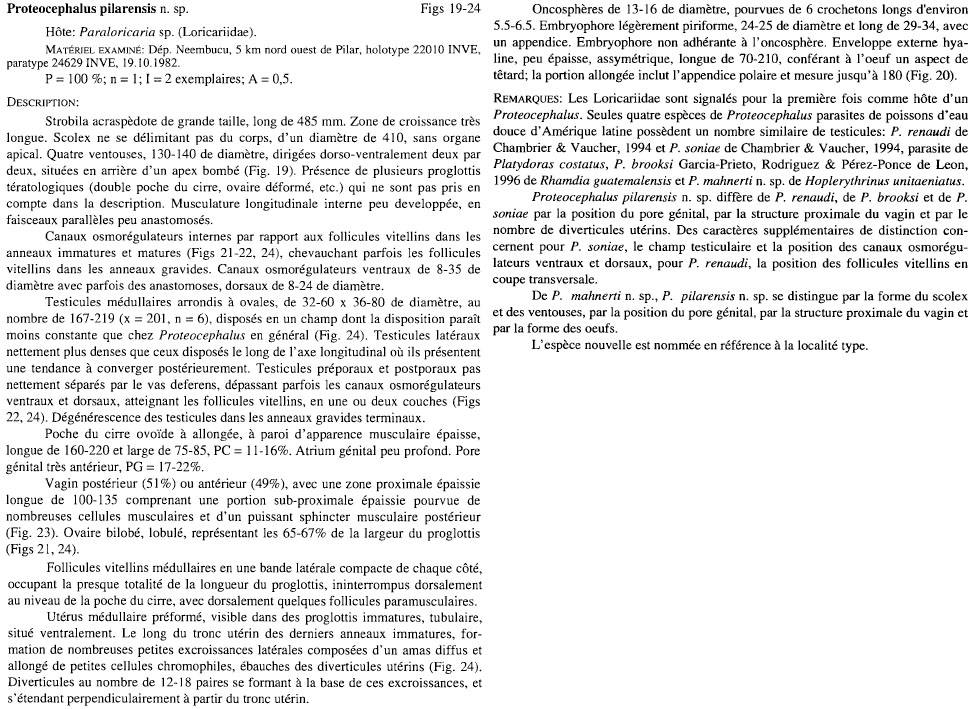 de Chambrier, A. and C. Vaucher. 1999. Proteocephalidae et Monticelliidae (Eucestoda: Proteocephalidea) parasites de poissons d’eau douce au Paraguay, avec descriptions d’un genre nouveau et de dix especes nouvelles. Revue Suisse de Zoologie 106: 165-240. (3925) Download PDF |