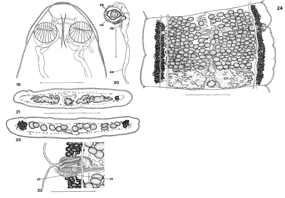 FIGS. 19-23. Proteocephalus pilarensis n. sp. holotype, 22010 INVE; 19, scolex; 20, oeuf; 21-22, coupe transversale d;un proglottis prégravide; 21, coupe au niveau de l'ovaire; 22, coupe dans la partie antérieure; 23, vagin et poche du cirre, vue ventrale. Echelles: 19, 23 = 250 µm; 20 = 50 µm; 21-22 = 500 µm. FIG. 24. Proteocephalus pilarensis n. sp., holotype, 22010 INVE, proglottis mature, vue dorsale. Echelle = 500 µm.