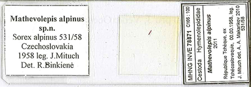 Binkiene, R. and L. Kontrimavicius. 2012. Mathevolepis aplina sp. n. (Cestoda: Hymenolepididae) from an alpine shrew: the first record of the genus in Europe. Folia Parasitologica 59(4): 295-300.