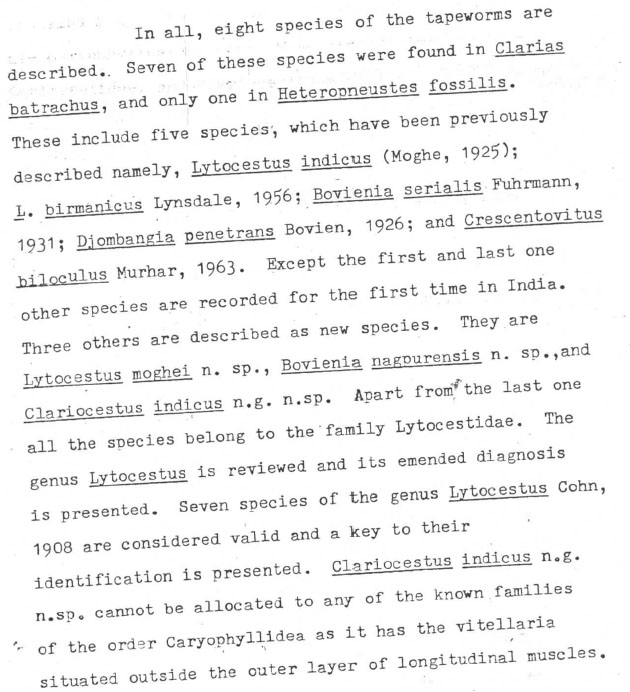 Murhar, B. M. 1973. Studies on some species of monozoic tapeworms (Cestoda: Caryophyllidea) from two catfishes of India. Ph.D. Thesis (synopsis) ". Doctoral Dissertation", Department of Zoology, Nagpur University, Nagpur, India, 28 pp. (5917) Download PDFAsh A., T. Scholz, M. Oros, and P. K. Kar. 2011. Tapeworms (Cestoda: Caryophyllidea), parasites of Clarias batrachus (Pisces: Siluriformes) in the Indomalayan Region. Journal of Parasitology 97(3): 435-459. (5944) Download PDF |