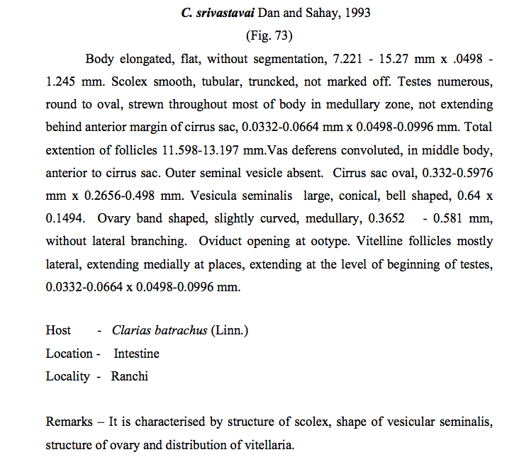 Ash A., T. Scholz, M. Oros, and P. K. Kar. 2011. Tapeworms (Cestoda: Caryophyllidea), parasites of Clarias batrachus (Pisces: Siluriformes) in the Indomalayan Region. Journal of Parasitology 97(3): 435-459. (5944) Download PDF |