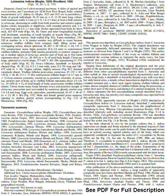 | Synonyms | Caryophyllaeus indicus Moghe, 1925; Caryophyllaeus java- nicus Bovien, 1926; Caryophyllaeus oxycephalus Bovien, 1926; Pseudoly- tocestus clariae Gupta, 1961; Introvertus chauhani Pandey and Tiwari, 1989; Pseudolytocestus thapari Gupta and Parmar, 1990; Lytocestus alii Jadhav and Gavahne, 1991; Lytocestus clariasae Jadhav and Gavahne, 1991; Lytocestoides clariasae Hiware, 1999; Lytocestus chalisgaonensis Kalse and Shinde, 1999; Lytocestus kopardaensis Shinde and Borde, 1999; Lytocestus naldurgens |