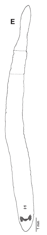 Figure 1. Outlines of adults of caryophyllidean tapeworms (Cestoda) parasitizing Clarias batrachus in the Indomalayan Region. (E) Lytocestus indicus (Moghe, 1925).