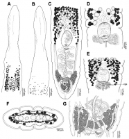 Figure 9. Lytocestus indicus (Moghe, 1925). (A,B) Anterior part of the body with the first vitelline follicles and testes. (C) Posterior part of the body, ventral view. (D, E) Region of gonopores, ventral view; note variation in the posterior extent of vitelline follicles in relation to the cirrus-sac. (F) Cross section at the level of the testicular region. (G) Ovary, ventral view; note the shape of the ovary and the absence of a seminal receptacle. Abbreviation: cga = common genital atrium.