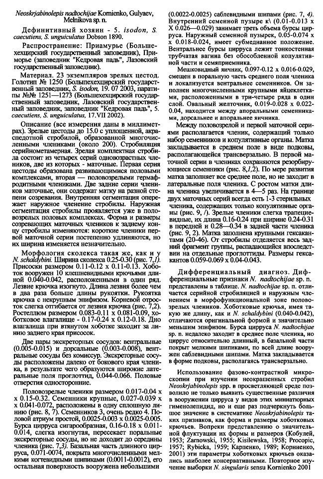 Kornienko, S.A., V.D. Gulyaev, and Yu.A. Mel’nikova. 2006. On the morphology and systematics of cestodes of the genus Neoskrjabinolepis Spassky, 1947 (Cyclophyllidea, Hymenolepididae) [In Russian]. Zoologicheskii Zhurnal 85 (2): 134–145. (5999) Download PDF |