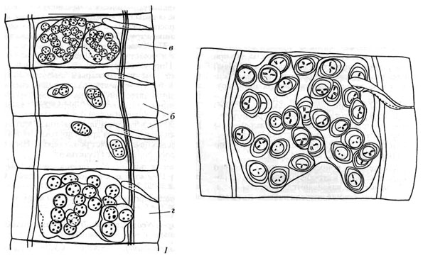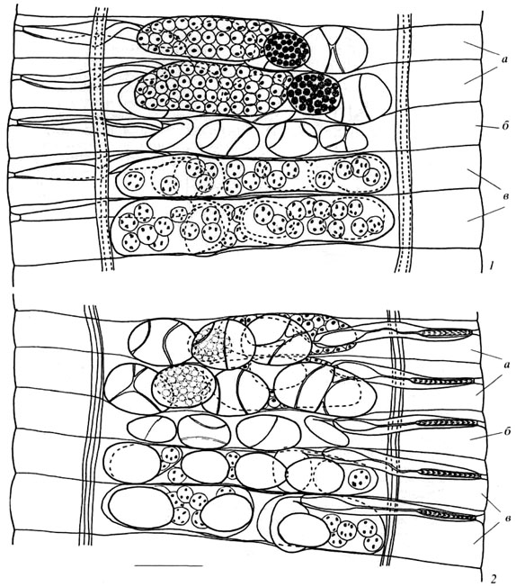 FIGURE 3. 1, Preravid proglottides; 2, Gravid proglottide. Scale-bars: 1-2, 50 µm.