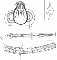 FIGURE 1. 1, Scolex; 2, Rostellar hook; 3, Cirrus-sac;. 4, Cirrus. Scale-bars: 1-2, 50 µm; 3-4, 20 µm.