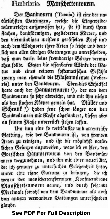Frölich, J. A . 1802. Beyträge zur Naturgeschicte der Eingeweidewürmer . Der Naturforscher 29: 5-96. (6570) Download PDF |