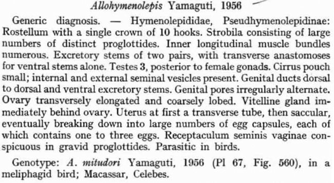 | Type Species | Allohymenolepis mitudori Yamaguti, 1956 |