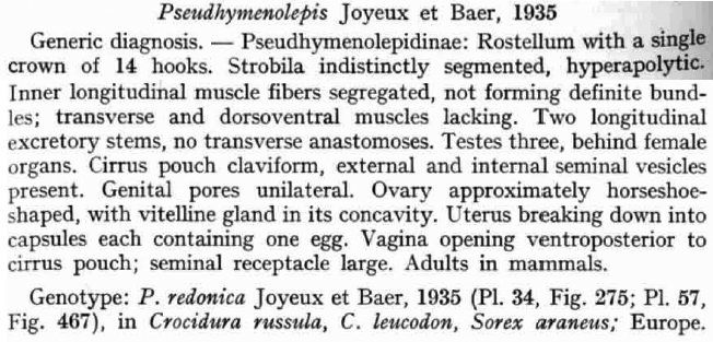 | Type Species | Pseudhymenolepis redonica Joyeux & Baer, 1936 |